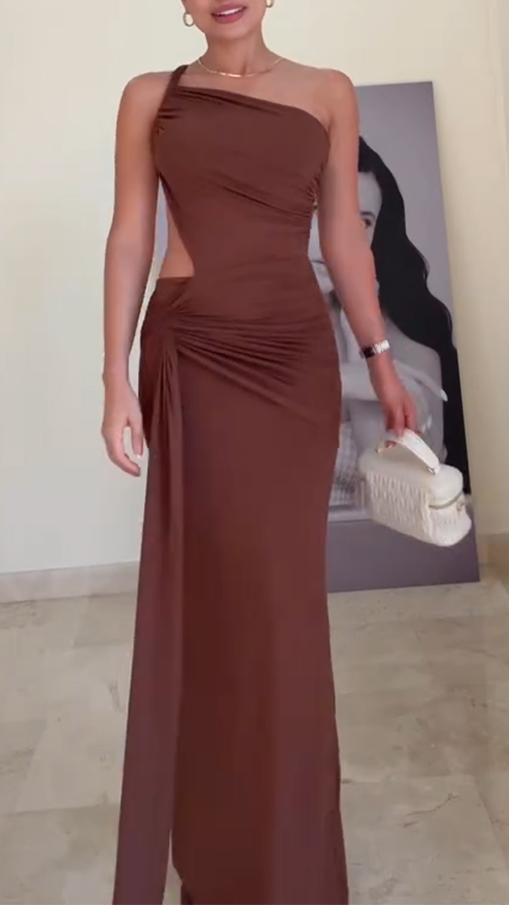This stunning asymmetrical dress redefines elegance with its daring design. The strategically placed waist cutout adds a touch of seduction while maintaining sophistication. Flowing into an ultra-long silhouette, the dress creates mesmerizing movement with every step. The back features an unexpected deep plunge, revealing just the right amount of skin for maximum impact. Crafted from luxurious fabric that drapes beautifully, this piece transitions effortlessly from red carpet events to exclusive soirées. The unique asymmetrical neckline frames the collarbones perfectly, drawing attention to your natural grace. Designed for the fashion-forward woman who commands attention, this dress combines boldness with timeless style. The elongated hemline elongates the figure, creating a statuesque effect that turns heads. Perfect for making a statement at any high-profile occasion, this is more than a dress—it's a work of art for your wardrobe.