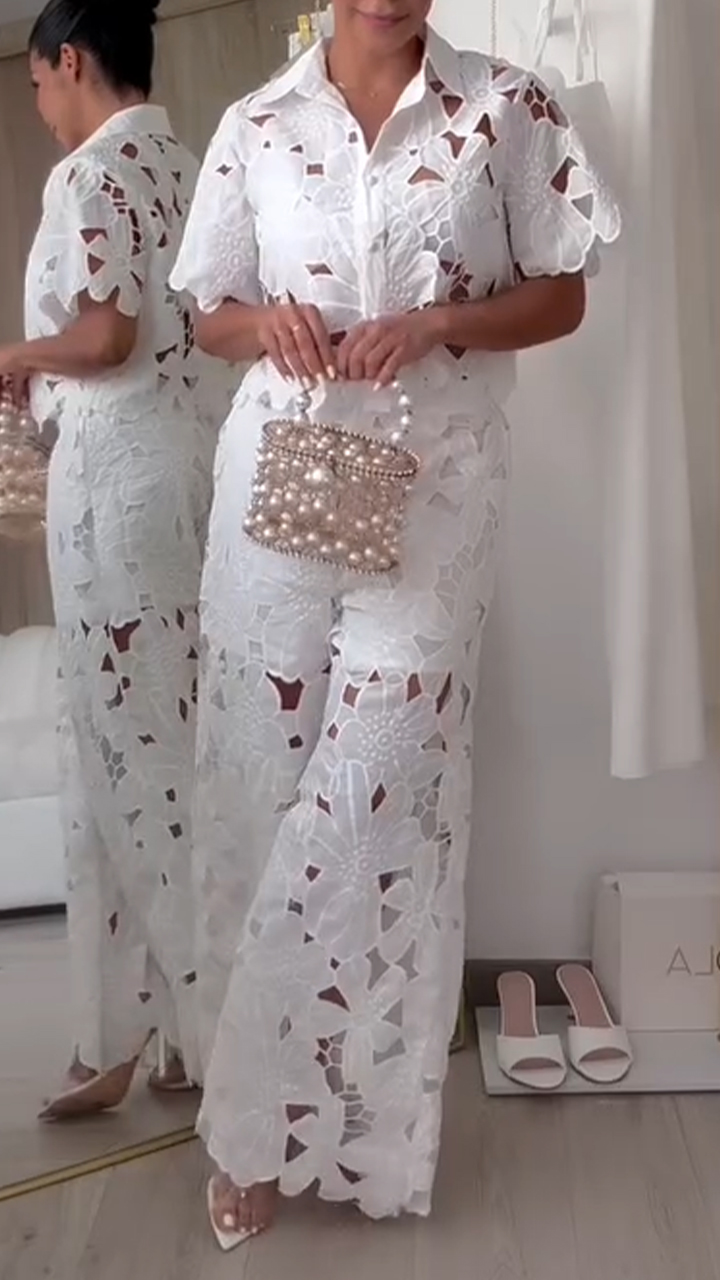 Women's Sexy Solid Color Hollow Cardigan Top Wide Leg Pants Two-Piece Set, Button Women's Lace 2-Piece Set